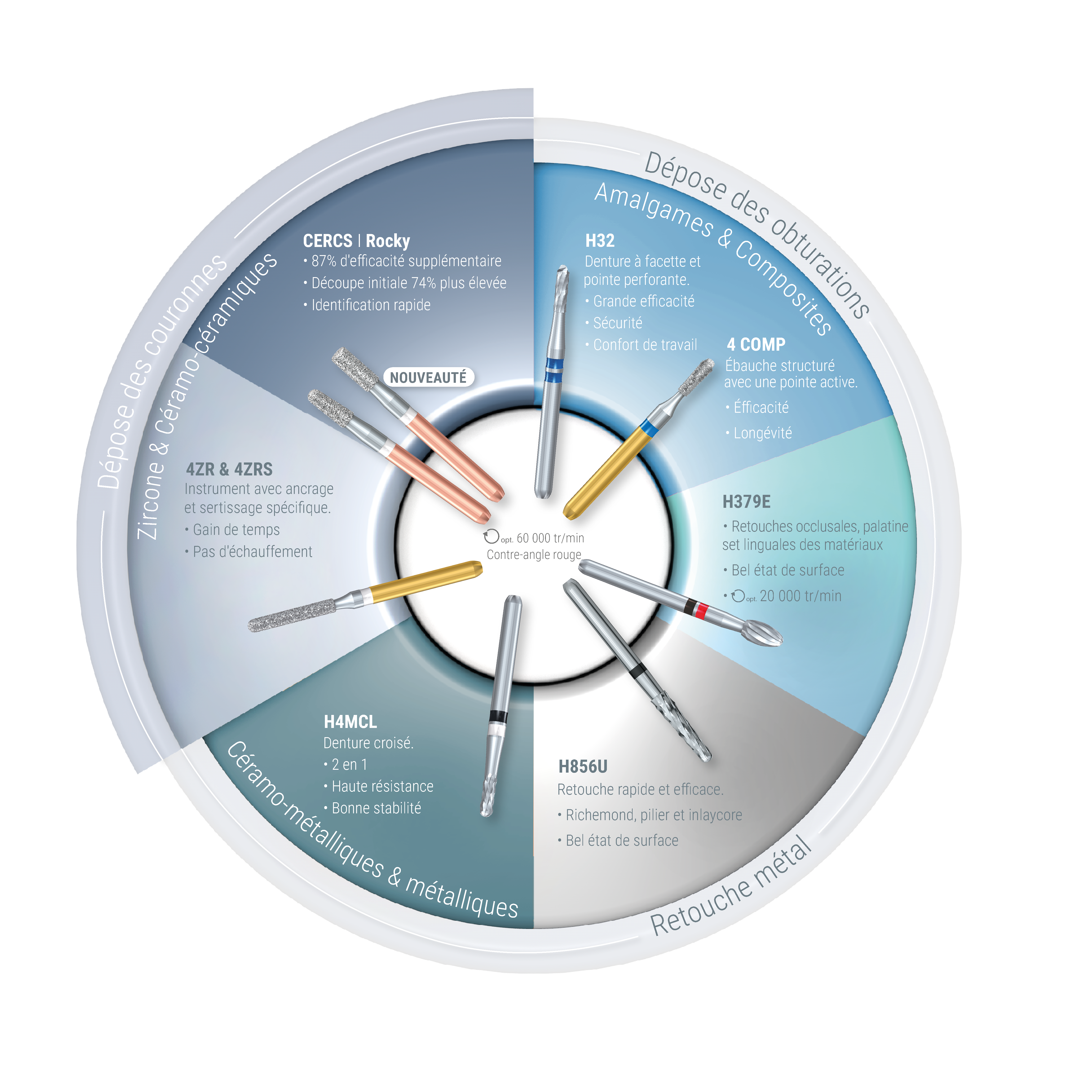 La dépose d’élément est un acte fréquent de votre quotidien : choisir l'instrument adéquat en fonction du matériau (composite, couronne céramo-céramique, céramo-métallique, etc...) est donc nécessaire pour simplifier cet acte et optimiser votre temps.